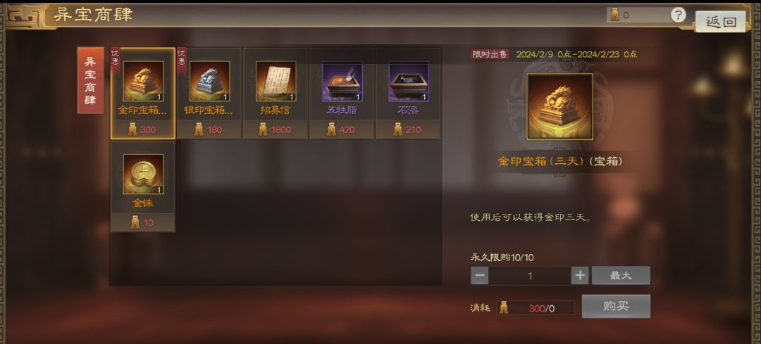 活动介绍:活动期间可在异宝商肆中消耗寄售币,兑换「秩奉万石·金印」和「秩奉万石·银印」的金铢赠送天数。简单来说,就是交易获得寄售币可以换大小月卡天数了,两者最高均可兑换10次!