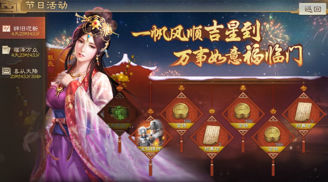 活动介绍:除夕、大年初一连续两天,阿棋都会安排给主公们发送新年祝福邮件,随邮件还有一份祝福金铢,主公千万别忘了上线领取奖励哦!