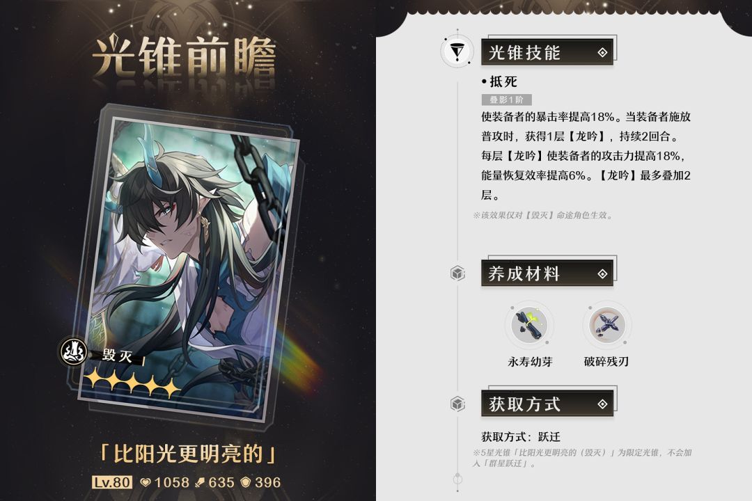 光锥效果是为角色提供击破加成,并在装备者施放终结技时为其提供暴击加成,比较适合对击破和暴击都有需求的毁灭角色。
