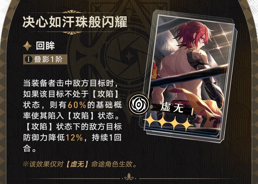 虚无角色的高泛用光锥,在叠影5后有100%基础概率为受攻击的敌方目标施加16%的减防。