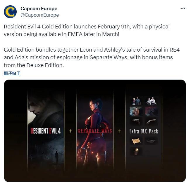 根据开发商卡普空透露,《生化危机4:重制版》黄金版仅会在欧洲地区发售实体版,其他地区只有数字黄金版,欧洲地区的实体版将于今年3月推出。