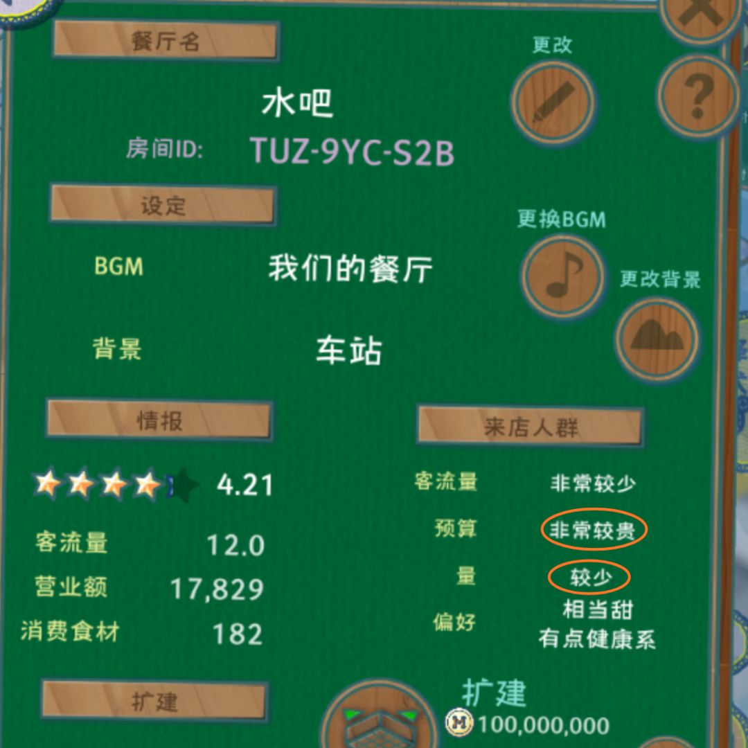 ① 来店人群的实时预算与实时【营业额/消费食材】的值有关,理论上能把预算刷到的极限等级与菜单上菜品的【价格/量】的值有关。