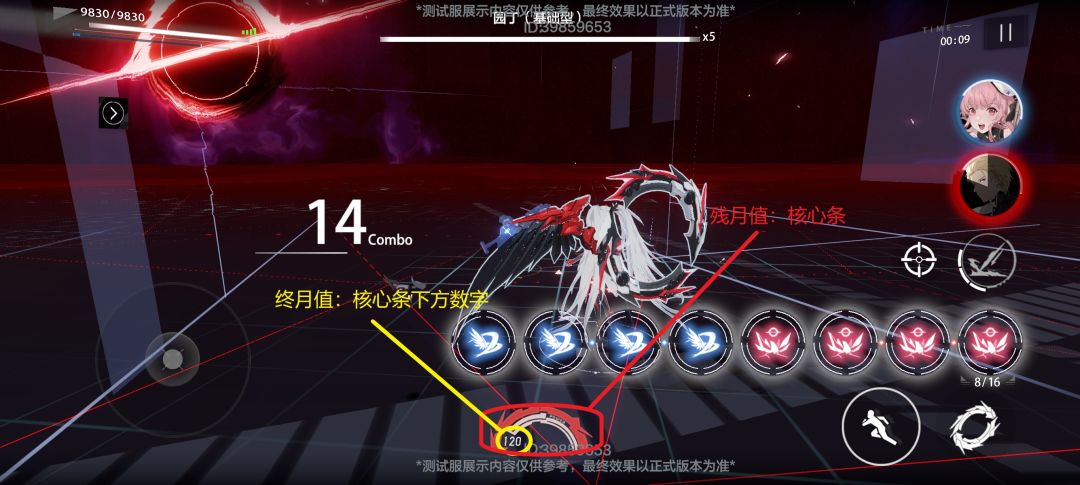 终焉在任何形态下消除信号球时都会获得残月值(即核心条充能)和终月值(即核心条上的数字)。