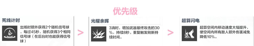 武器共鸣优先级为:死线计时>光耀余晖>超算闪电(注:个别场合时优先级可能有差异)