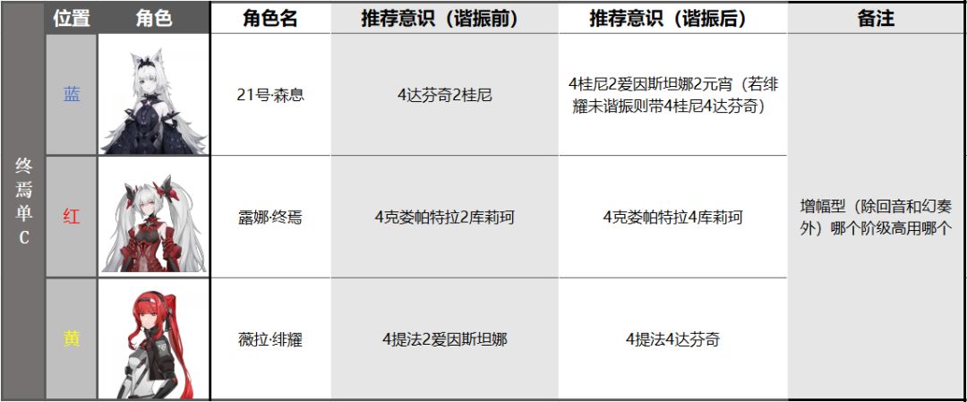 ④、配队推荐:终焉单C,终焉+绯耀+森息/万华;终焉轮切,终焉+尘铭+森息/万华(极昼达到3s且跃升则极昼也可);过渡队伍,终焉+弧光(xxi达到3s阶后可以替换弧光)+觅语