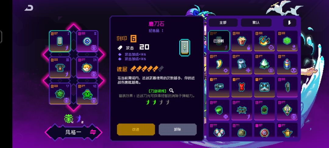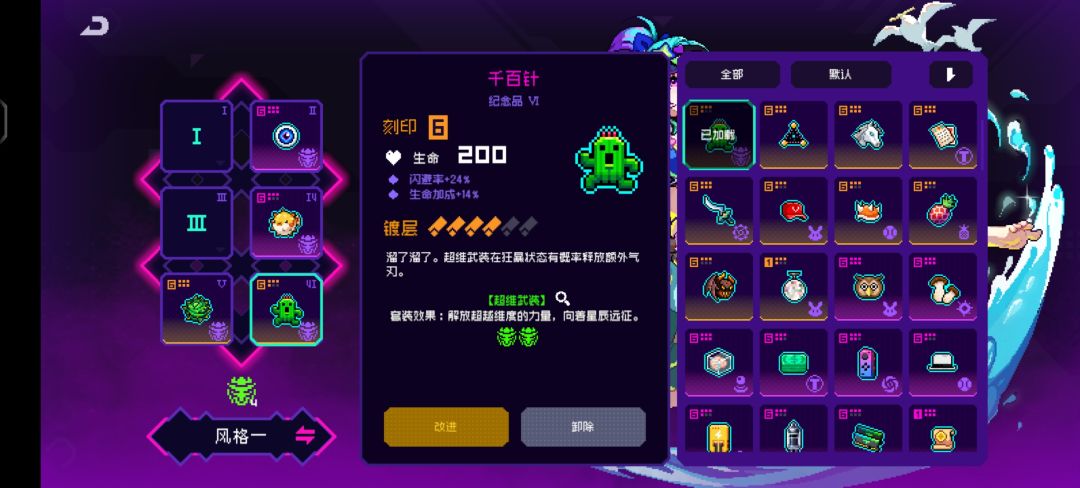 下面讲解进阶套装,由于定向甄选和霓虹币奖池一样,100 抽必出 up,所以考虑歪和不歪,刀二的第二类核心装备,千百针,有几率释放多道剑气。