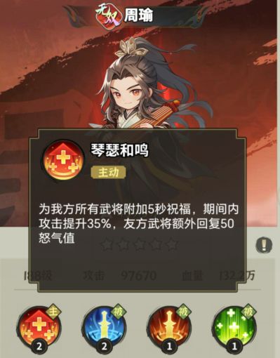 1、周瑜,推荐度★★★★★。非常强的辅助,增加上阵武将的攻击和怒气速度,而且有三个技能就能用了,四技能可以无视。如果不知道培养什么可以就养他,万金油,基本都能用。