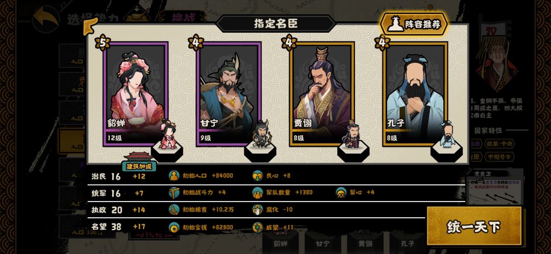 中间过程没啥好说的,战力差不多就把董卓拍死,慢慢团建就结束了。实际我就打了三座城,董卓两座还有一座公孙瓒(因为公孙瓒守共伐守住了,我看袁神打了一年,自己上手才发现已经堆到一千战力了...)政策的话,军事页和民生页一个没点,政治页点了几个。