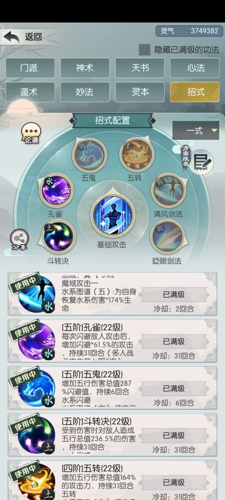 人物技能从左至右:五行斗转决,孔雀明王决,五鬼迷踪决,五转圣功,清风剑诀,眨眼剑诀