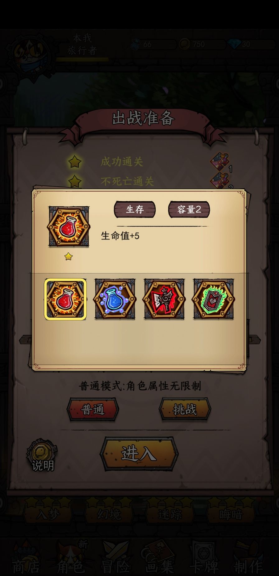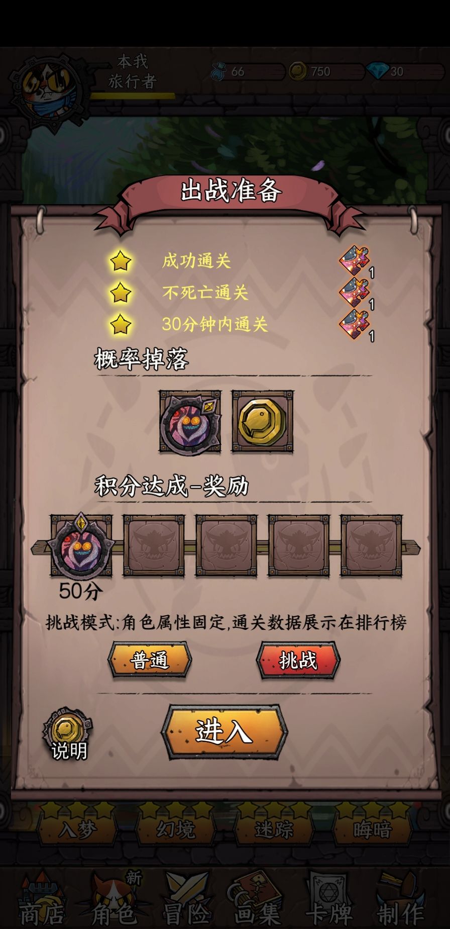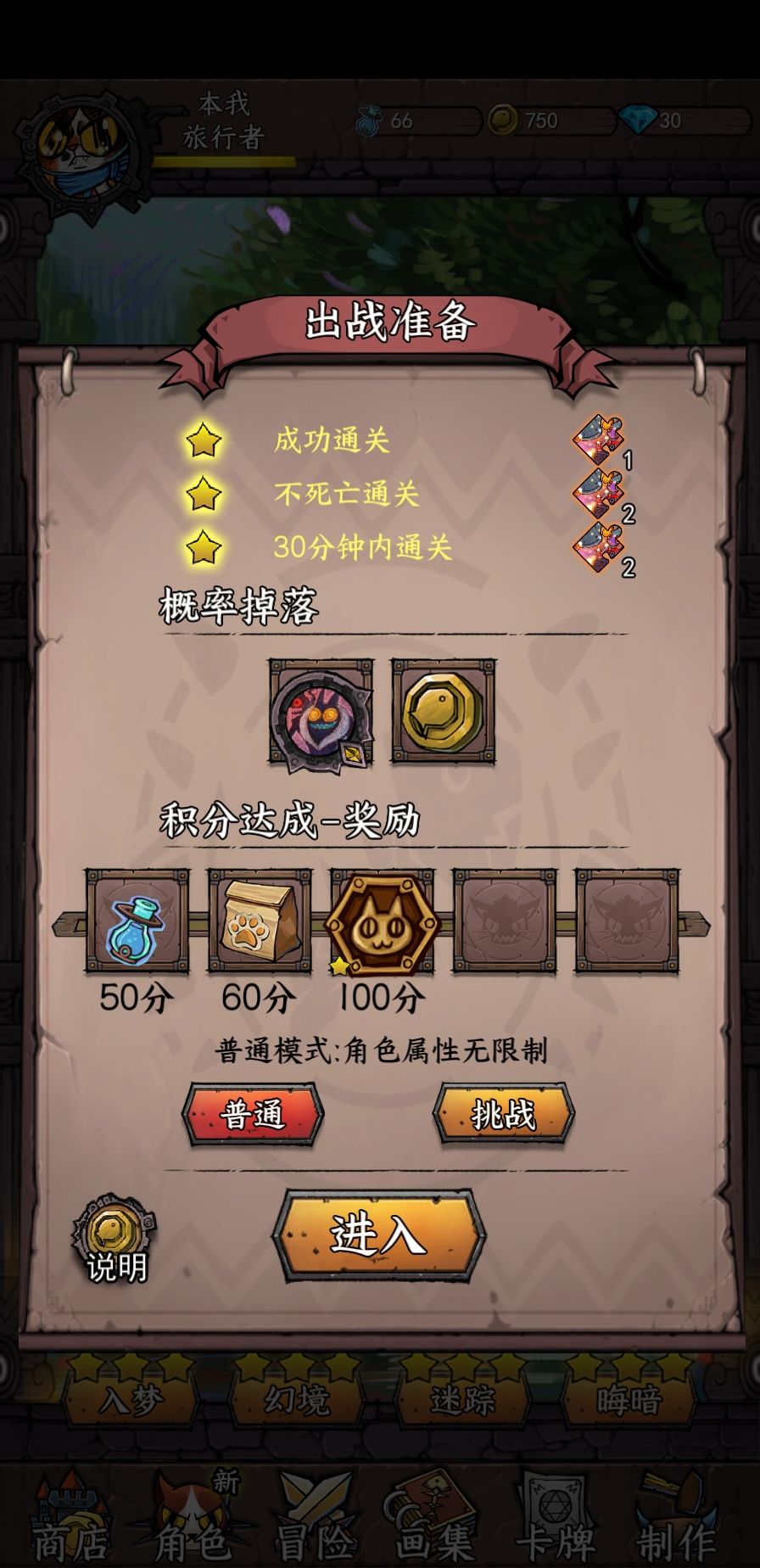 关卡分为普通和挑战两种难度,普通难度使用自己角色的属性,挑战难度使用固定数值。