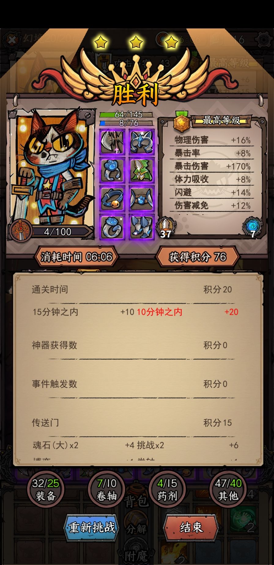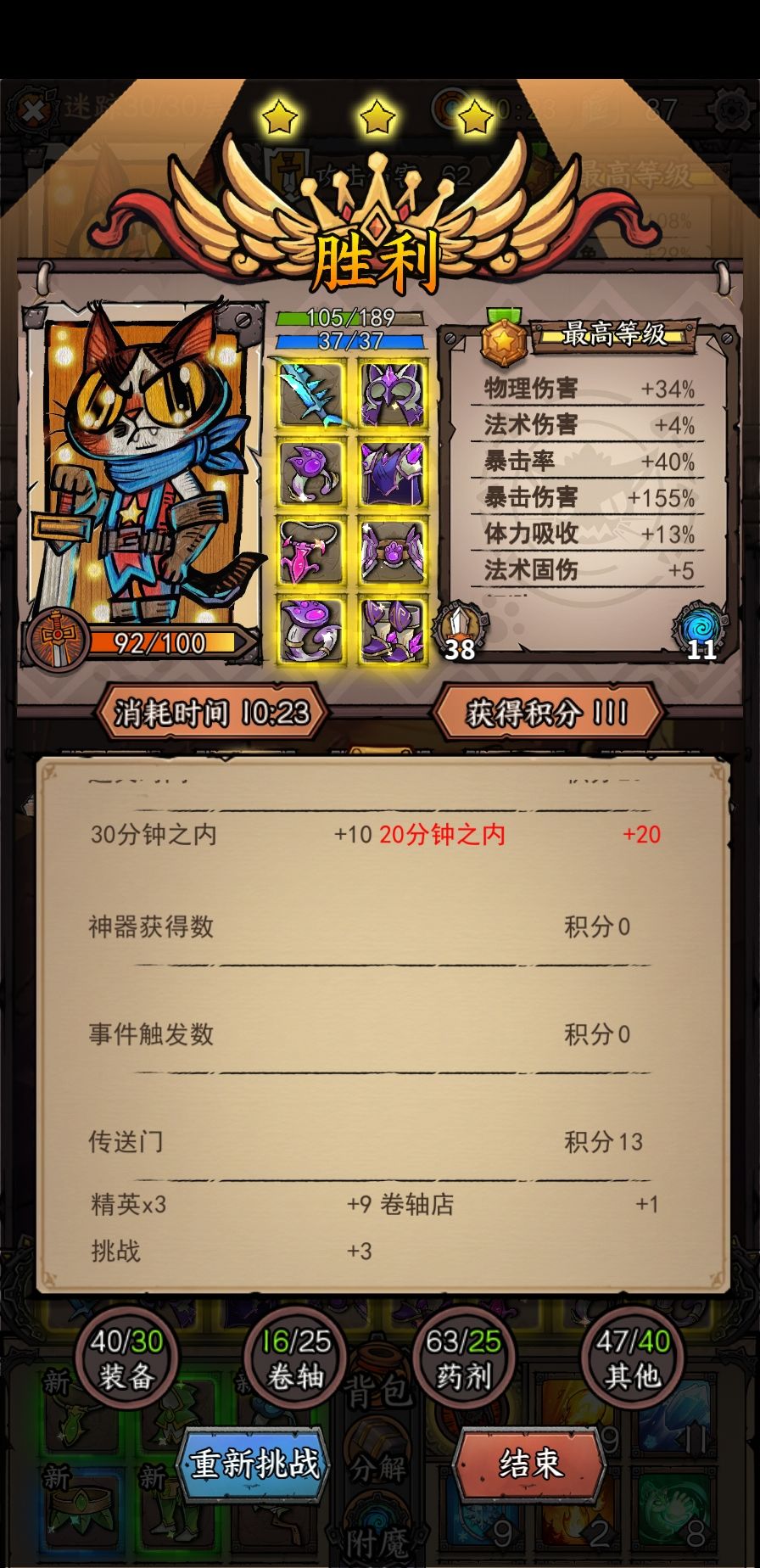 总结:装备和其他两项得分比较好拿,卷轴相对来讲是小分项目,争取在boss战前放几种法术,对于稀有卷轴如果只有一张,可以留到最后不使用,可以加5分,卷轴项目分争取拿满。药剂可以留大、中蓝瓶和魔力药剂来刷分,毕竟这游戏物理流派很强势,当然有需要还是该用用不用留![[表情_微笑]](https://img.tapimg.com/market/images/0f170d4b1ecf80c267e5a44b5992a199.png)