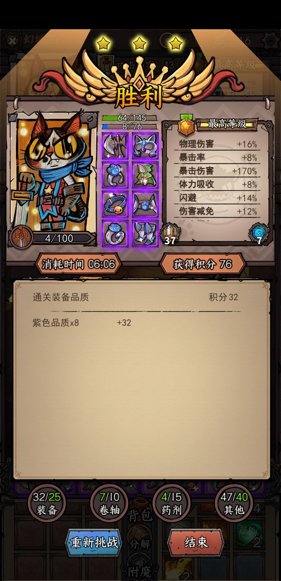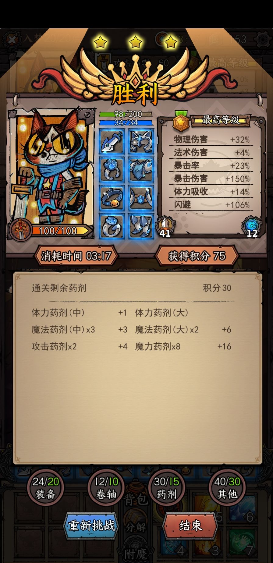 通关结算积分由四部分构成,它们分别是装备、卷轴药剂和其他构成,每部分都有其分数上限(随关卡不同会有变化)和结算标准。由于四部分分数的上限以及得分难易都有不同,所以在刷分方面,我们一般要更关注的是卷轴以及药剂(药剂尤为重要)。