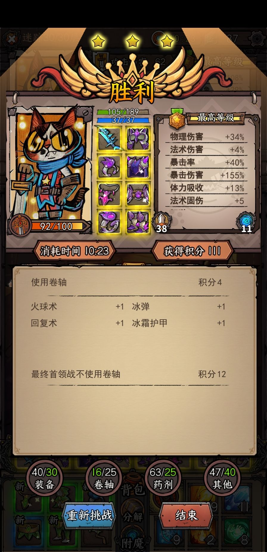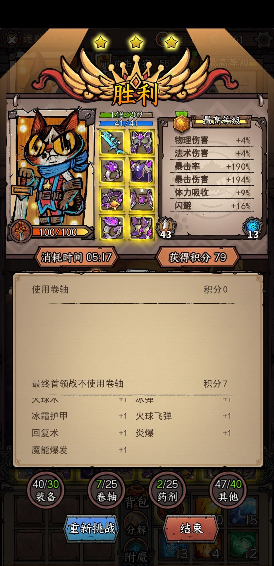 卷轴:分为两部分,使用卷轴的种类数量和boss战时没有使用的背包里的卷轴种类