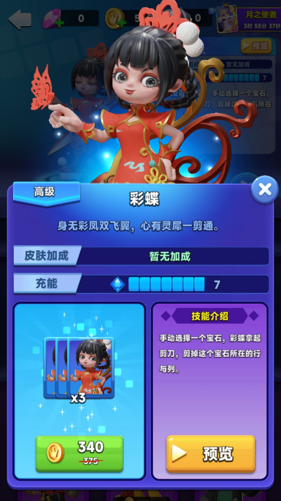 彩蝶的卡牌技能是:手动选择一个宝石,彩蝶拿起剪刀,剪掉这个宝石所在的行与列。属于较为简单的选择型精灵卡牌。