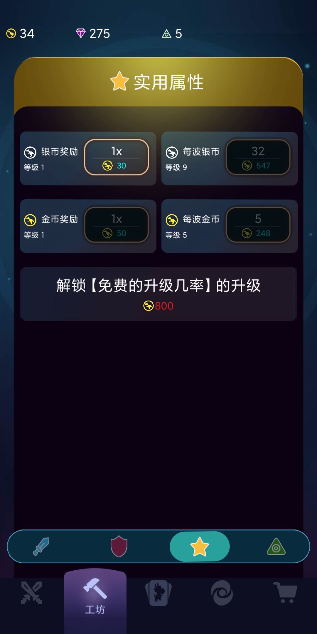金币都用来升级工坊的“每波银币”“每波金币”