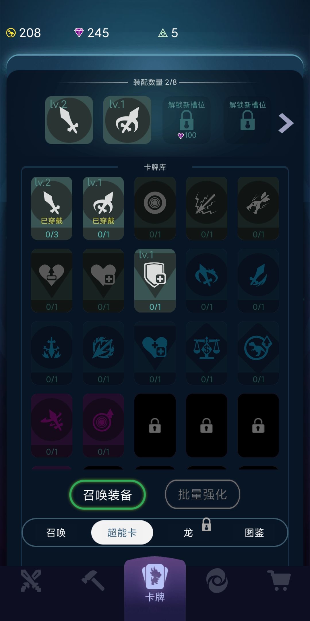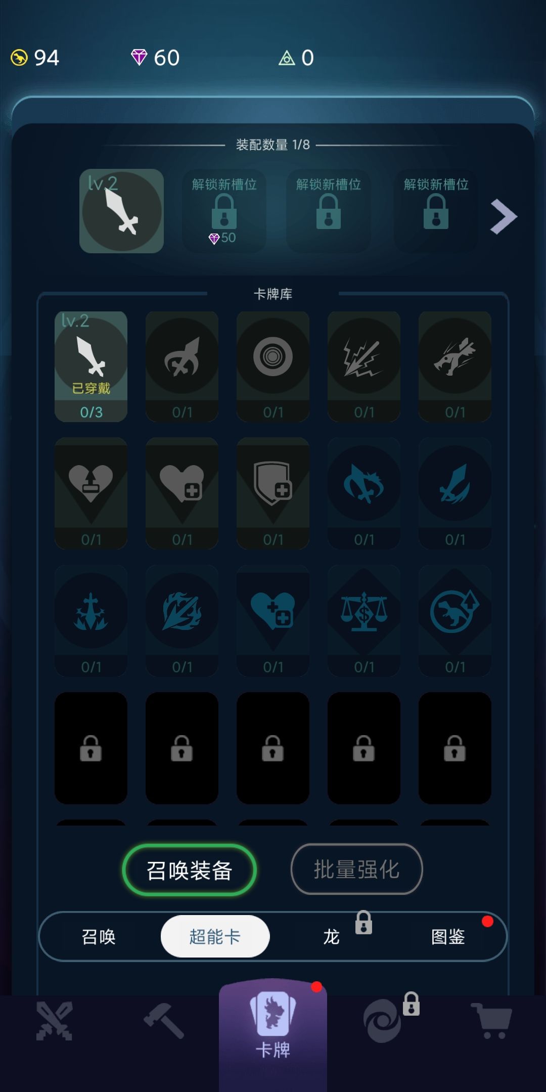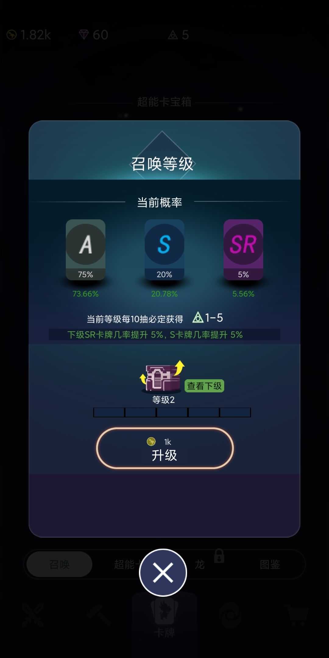 3)关键的是接下来的超能卡开放,除了新手引导送的“攻击”,通过广告可以再获得多一张。如果抽到好卡就开卡槽上两张。我运气不好抽到了重复的攻击卡,只能升2级。记得升级图鉴,也能提升2点攻击