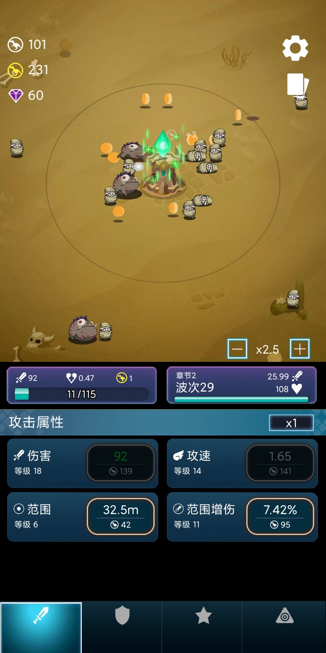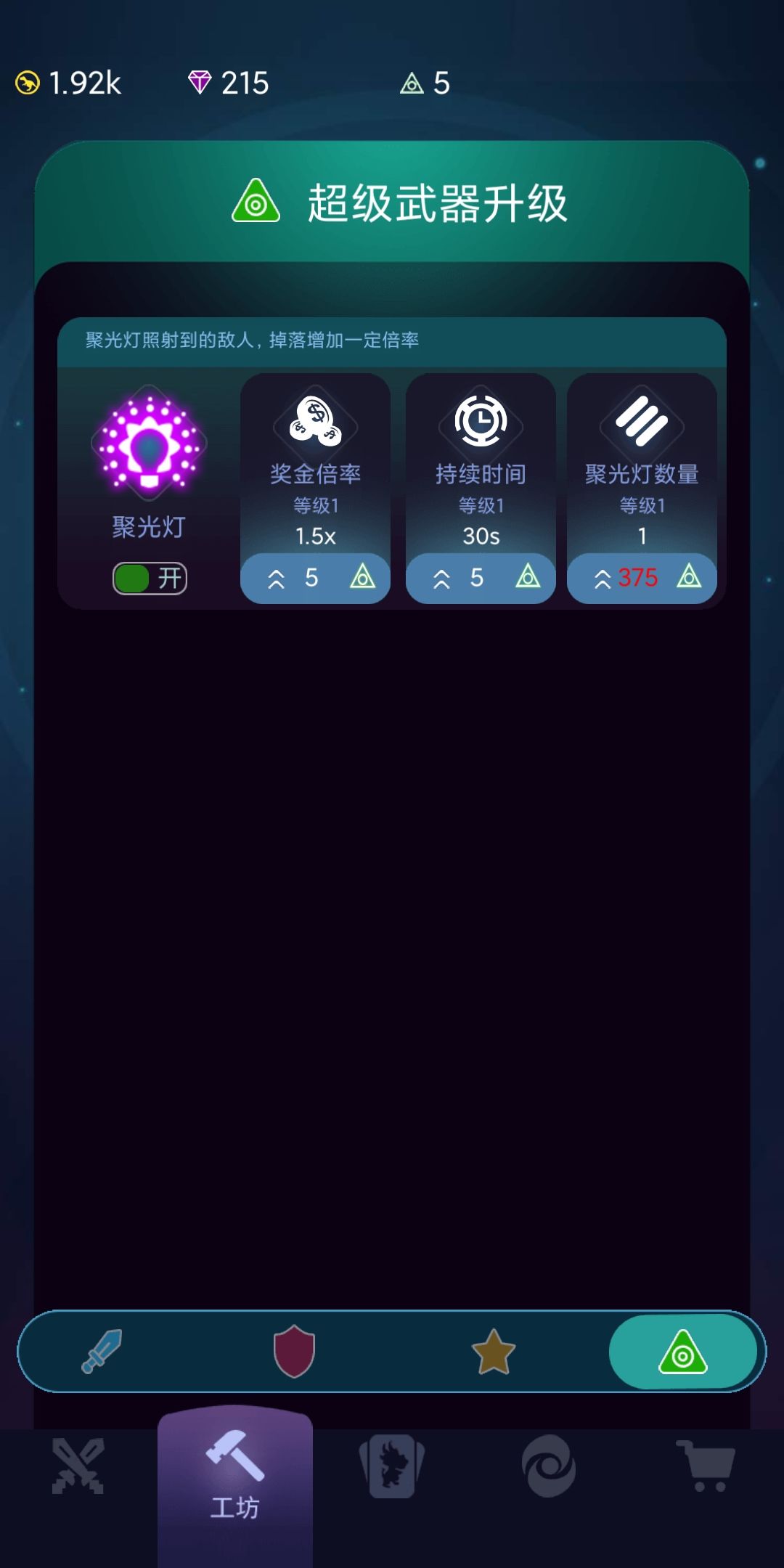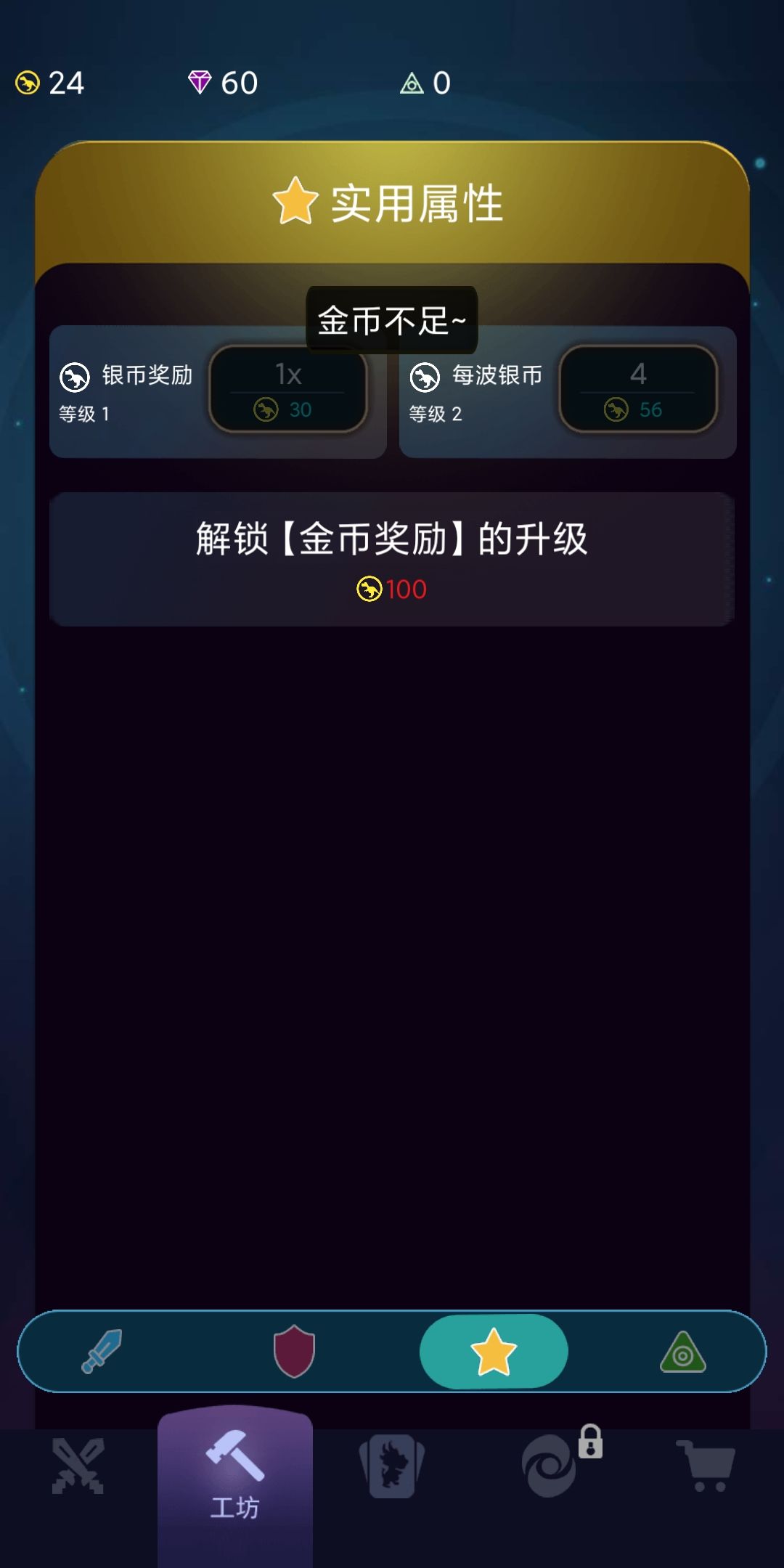 4)另外一个就是工坊,使用全部金币,解锁第三页里面的“银币奖励”属性,把“每波银币”升到最高(里程碑里面领取金币)