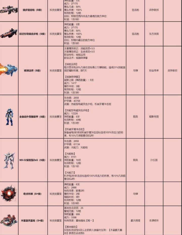 全自动外骨骼装甲(s级)、MX-02实验型ZaG(s级):这两个的推荐理由也是大差不差,因为提供大量的属性和能开载具羁绊(说真的,科技类重宝除了载具,基本没啥能用的,大家也就前期用着好一点,后期那点血量和护盾也不太够看)。