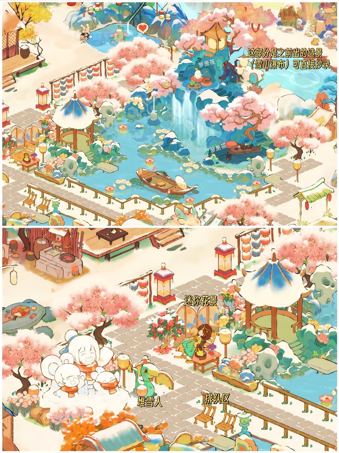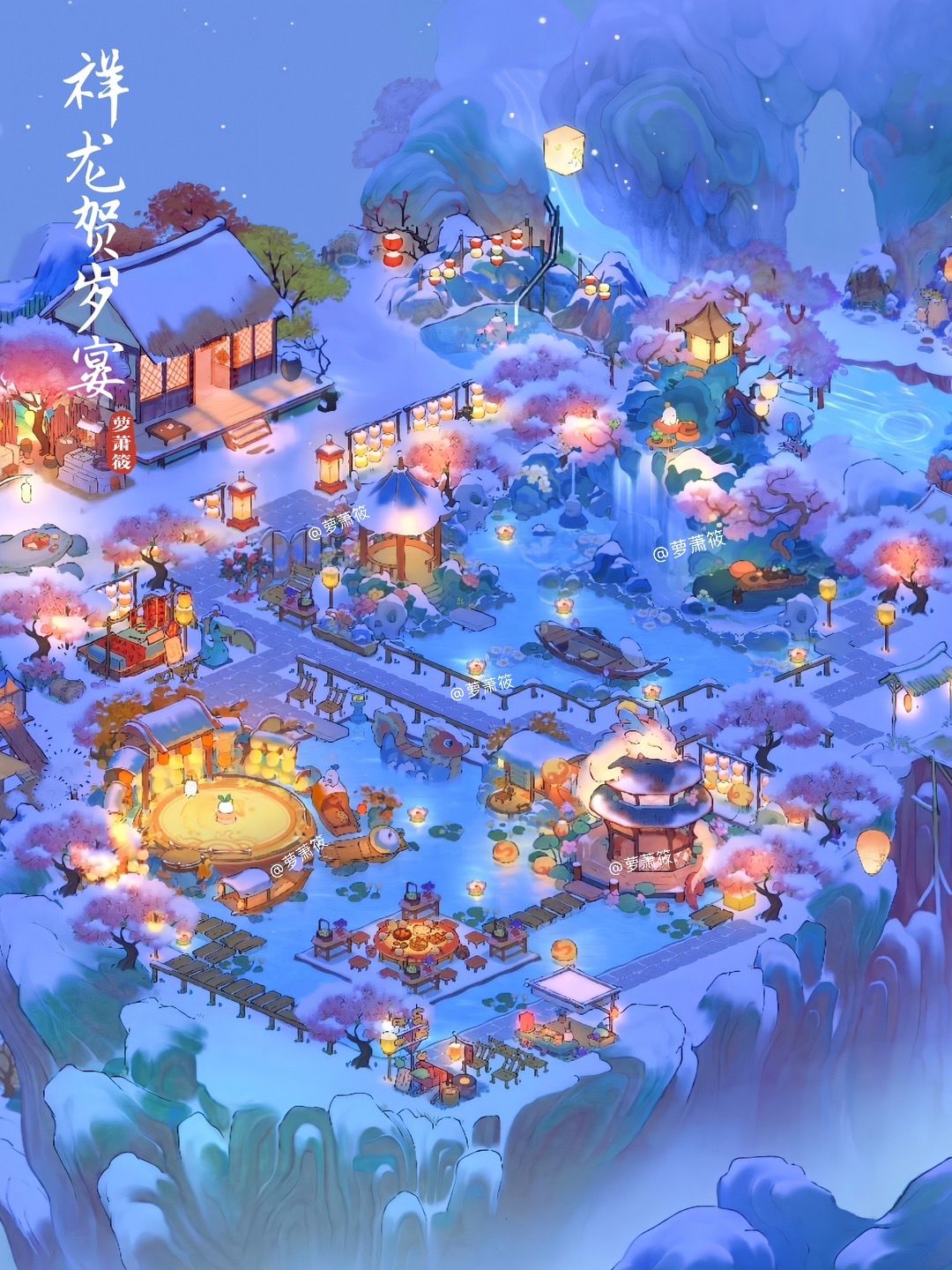 🌸主要建筑:水云静栖 有龙则灵 舞榭绮梦 年夜宴绘春题联 涟舟轻荷 牡丹亭 吹糖浇蜜 果酿甜醉 梅妆惹香 凝心静水 碧波龙舟