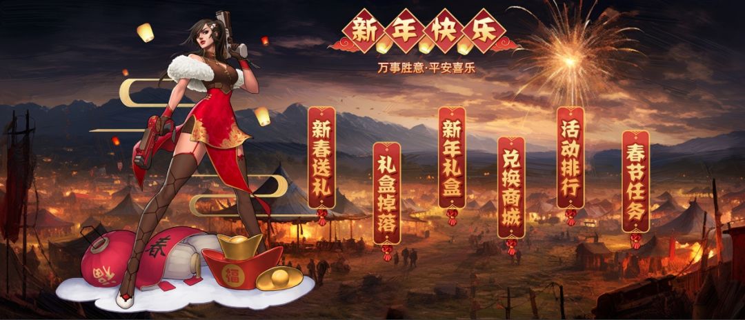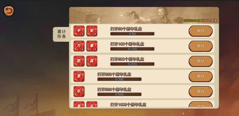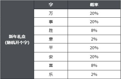 活动期间可免费领取新年礼盒2个,领取挂机奖励也可以获得新年礼盒(每4小时产出1个新年礼盒),使用单个新年礼盒可获得随机的灯笼(万、事、胜、意、平、安、喜、乐8个不同的灯笼之一)