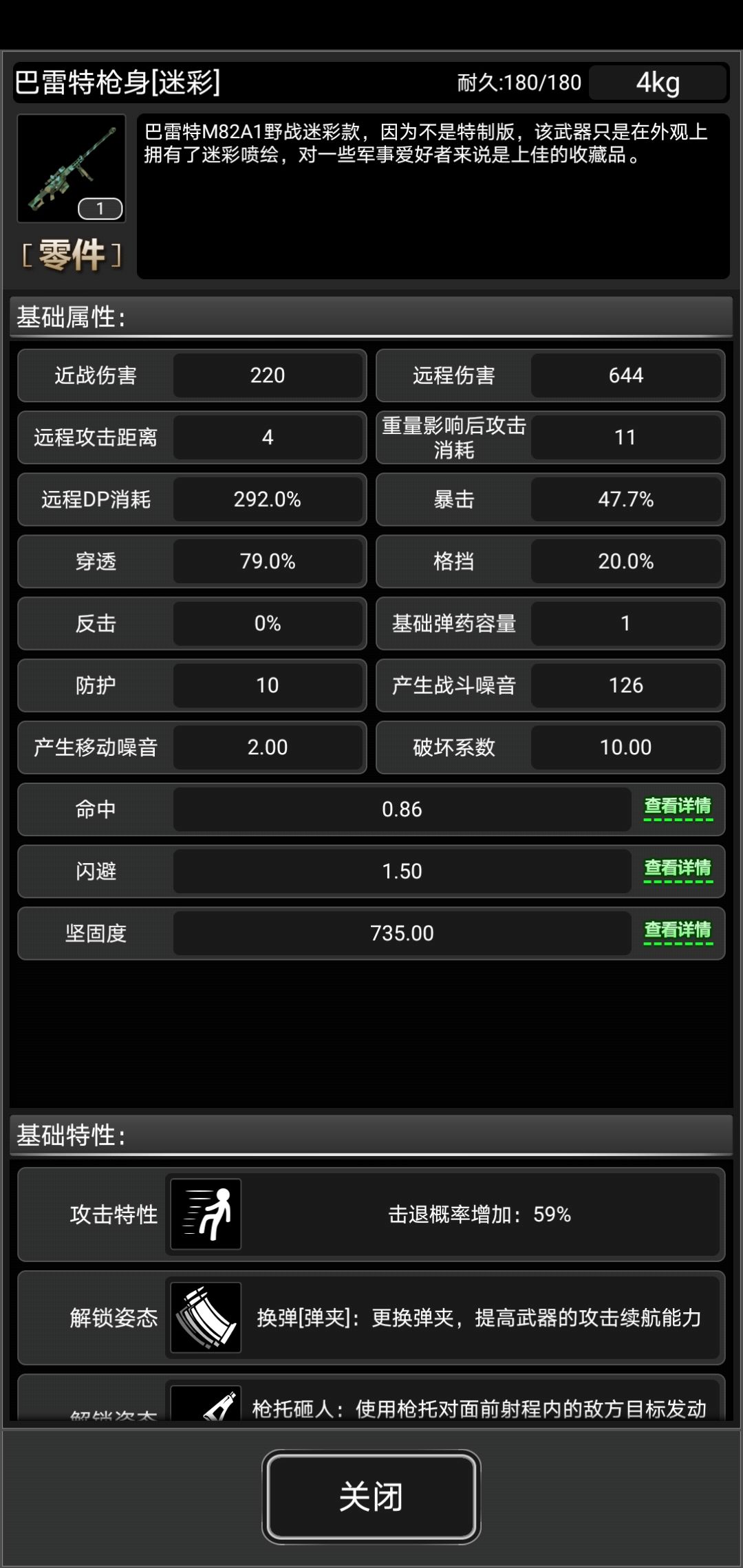 龙步狙:有击退,击晕属性,伤害最高,射速最慢。对单压制性很强,对群压制性很弱。所有武器中噪音最大180点。唯一需要维修包修理!(蹦迪武器首选)