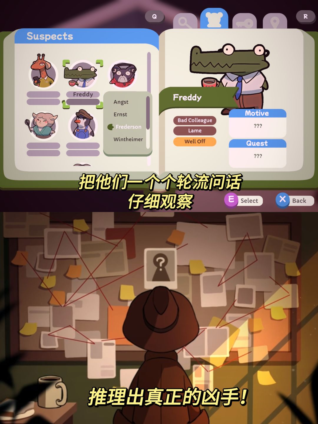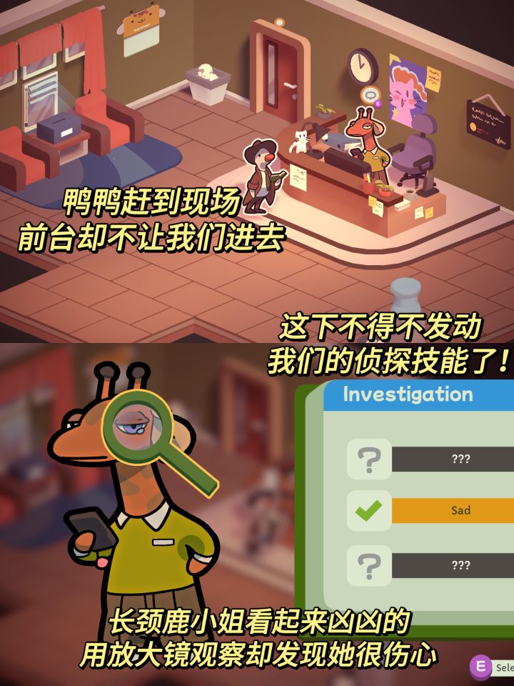 游戏还有其他可爱的小动物,像严肃的长颈鹿小姐姐,软乎乎的可爱小羊,咋咋呼呼的考拉……可惜我们的嫌疑人也藏在其中!