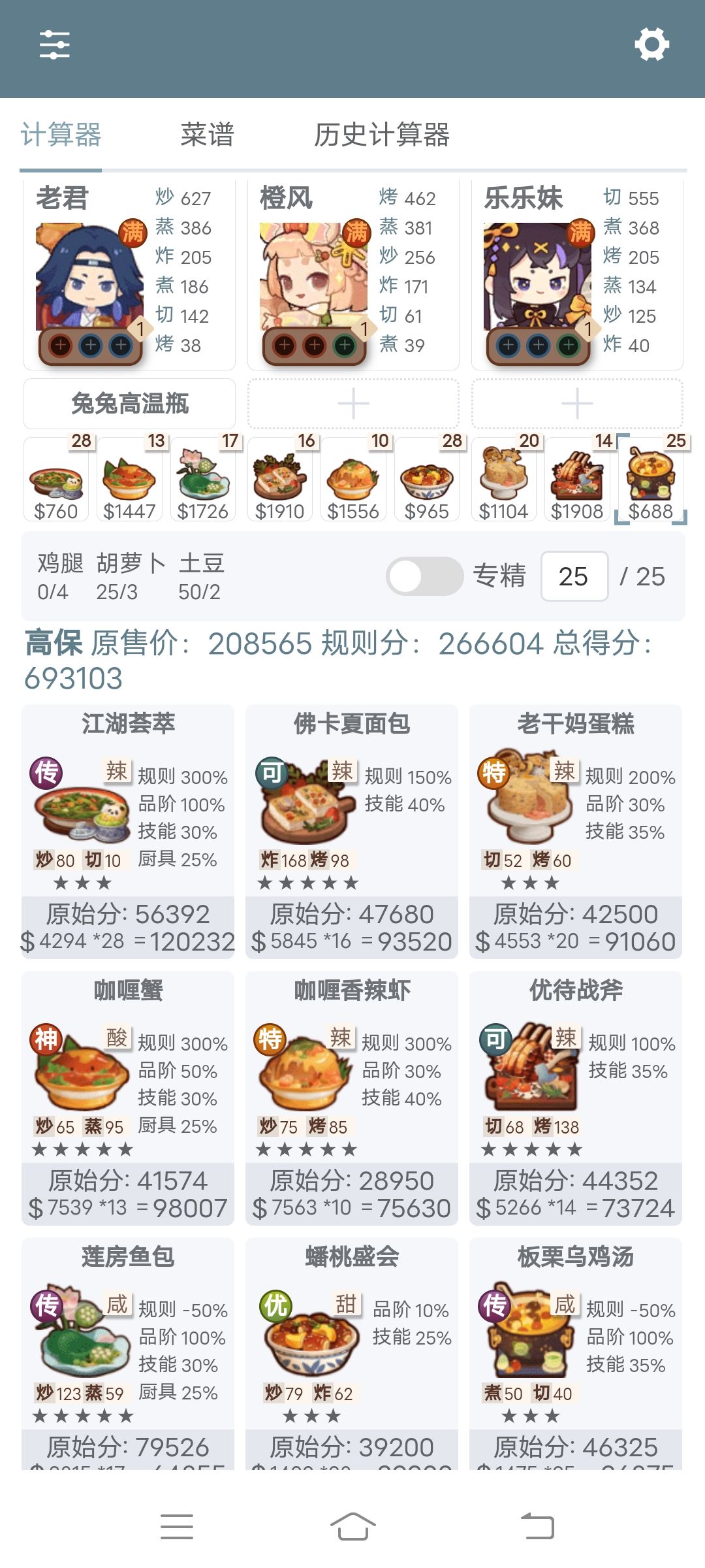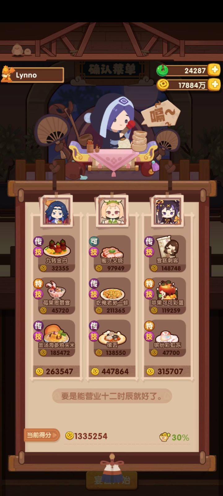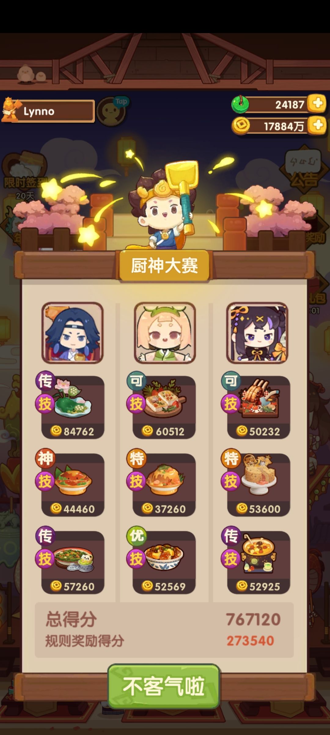 厨神比较容易,全高,大号76w,小号三菜高保。桂小乌值得表扬,双绿槽厨师,既能下地,又能做炒烤菜。