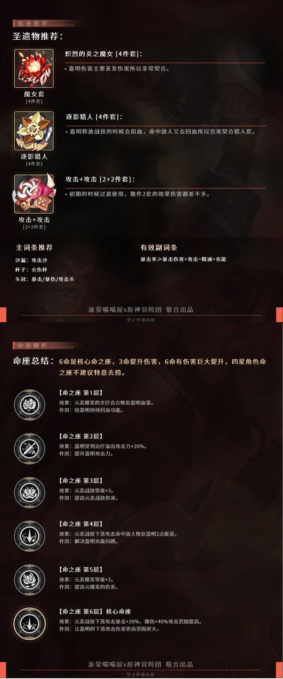 嘉明释放元素爆发后可以吃满魔女套的效果,吃到魔女套的全部增伤,毫无疑问是伤害最高的选择,自身的烧血机制也可以使用猎人套大幅缓解圣遗物双暴压力,新玩家建议刷猎人套,合成台换魔女,先有一套可以使用的套装再追求更高的伤害。