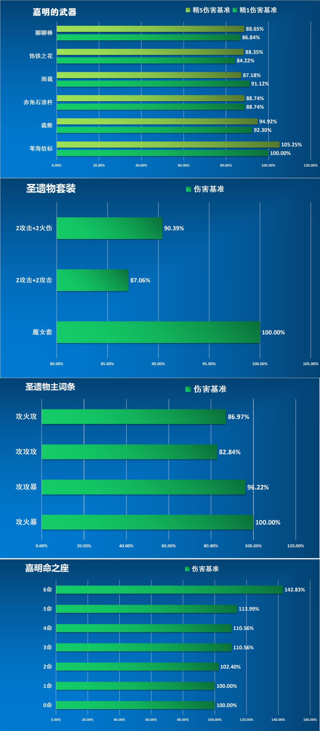 效果:嘉明生命低于50%治疗+20%,高于50%元素战技伤害+20%