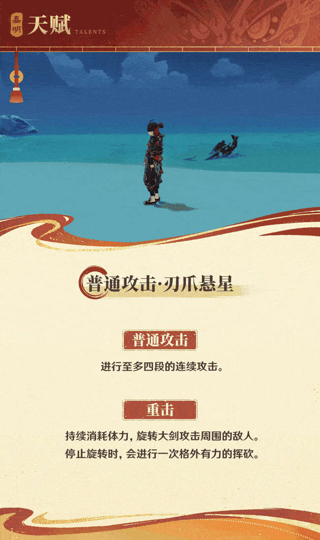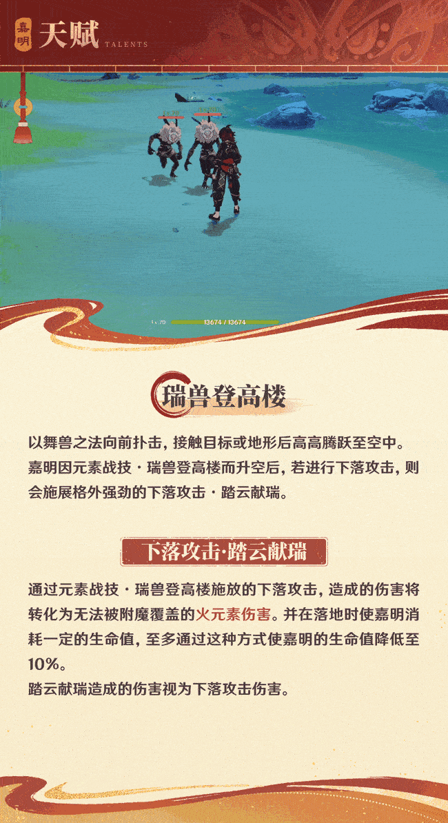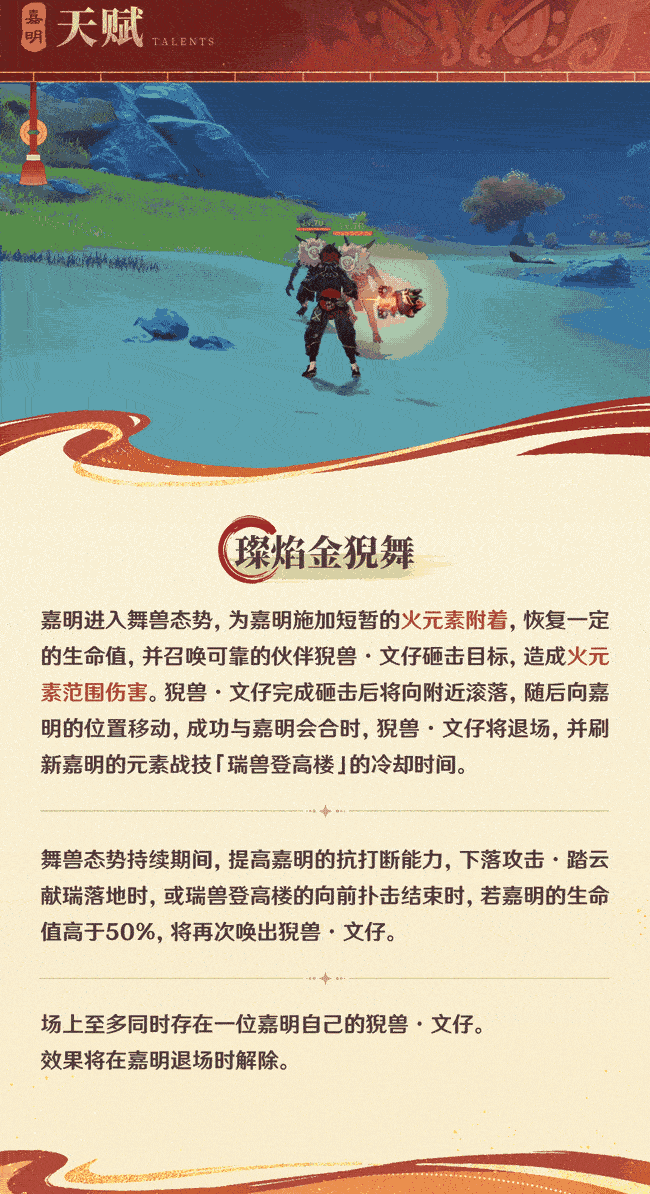 效果:释放后进入舞兽姿态,为嘉明短暂火附着恢复生命值,并且召唤文仔造成火元素范围伤害,文仔与嘉明会合刷新元素战技冷却。