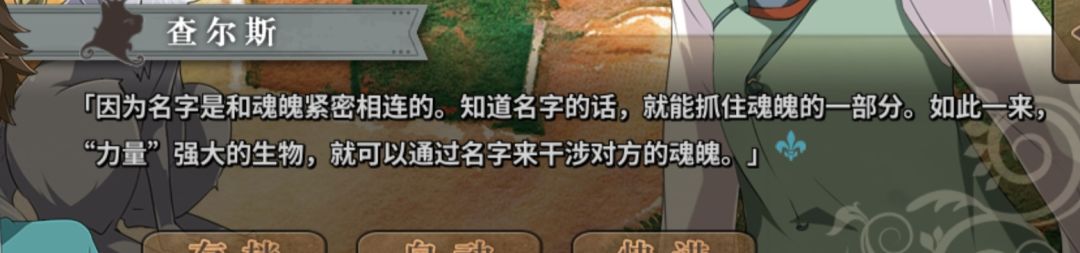 大家应该可以看到此时菲由的一只眼睛为红色,后来我把有菲由片段又快进看了一遍,都是蓝眼睛,红眼只有这里出现过,感觉就像是背后控制菲由的人在以为大功告成之后放松警惕露出的一点本体,这么说来控制者应该是红眼睛。至于控制的方法,就是我认为控制者是杰克的原因所在,剧情中幸歌有某种关于梦的能力,其父亲的能力应该更强大,在麟篇查尔斯聊到梦境时描述“力量强大的神物可以通过名字干涉其魂魄”“以前人们都隐姓埋名生活”截屏如下