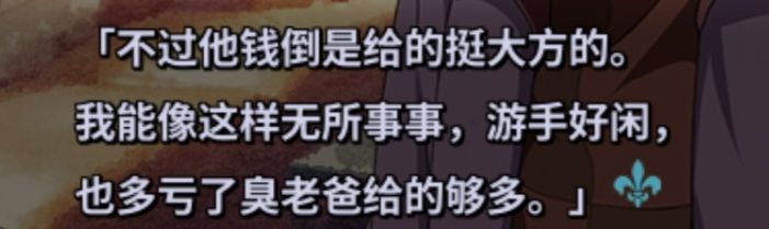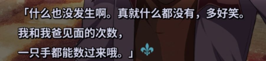 8、在短剧中幸歌放弃调查结局中,菲由明白自己的计划失效,就命令斯库尔停止行动,并指出期待“那个人”下一步的计划,也就是说菲由的行动是有同盟的,会是杰克吗?我觉得不尽然,根据以上的推理,杰克此时应该是控制菲由的状态,自己叫自己就显得很唐突,所以应该另有其人。呢么又会是谁呢?此时我想到了麟篇出现的一个跟剧情关系几乎没什么关系的人,幸歌的老师——约翰。要知道制作方本来就不是很有钱,肯定不会浪费这里面画了立绘的角色的,更何况他看到麟的发饰时觉得很奇怪,截屏如下,