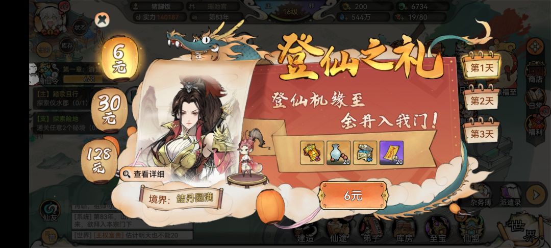 这个时候我们一定要见招拆招,首先第一招登仙之礼:登仙机缘至!金丹入我门!这里有三个档次登仙,6就是一个金色绝伦资质弟子,30是绝版加资源的建筑,128是一个红色逆天资质弟子。分为三天,每天都不同,只要大帝你抗下了第一天的6 30 128威力的招式,第二天第三天自然也可以抗下。