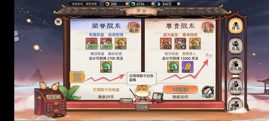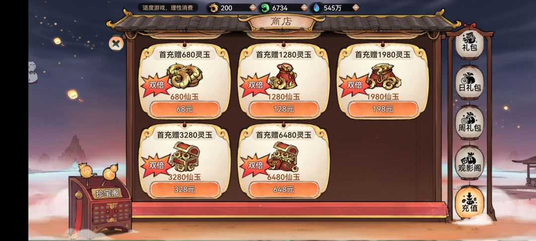 日礼包和周礼包有些可以灵玉购买的,偶尔可以去看看。不然送的几千灵玉我们花不完……