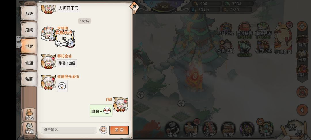 对了,好像忘了讲一下灵玉。这个货币嘛我们可以从游戏里很多任务获取。比如爬塔奖励,所以作为零微氪大帝我们要积极一些,平常可以多去世界频道发言活跃一下。大家一起努力爬塔!