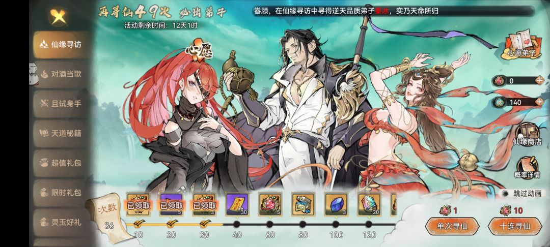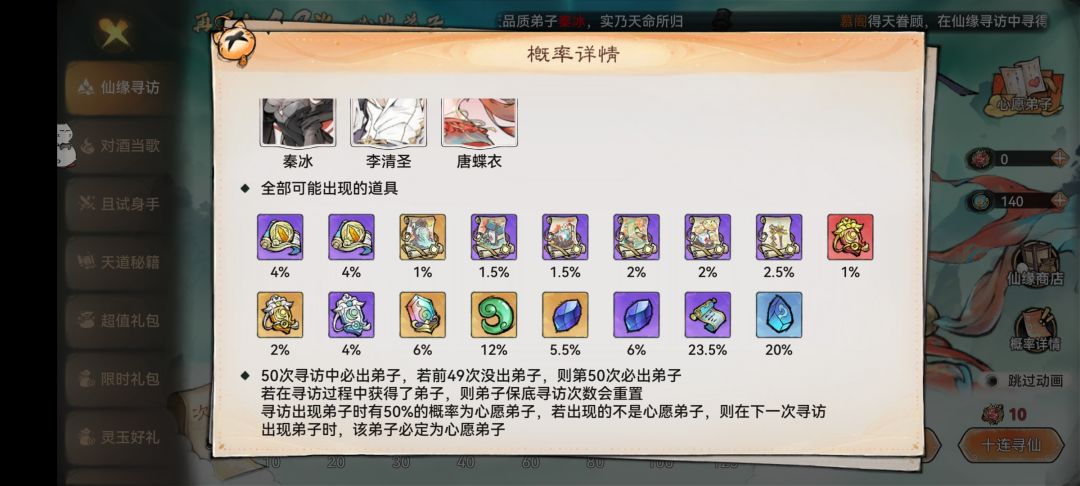 开局做完任务大家都会有10个以上的寻仙令,这里抽中红色弟子的概率是1.5。保底50是必出的,出了后有一半概率为心愿弟子,心愿弟子毫无疑问选李清圣贼帅~出招有特写