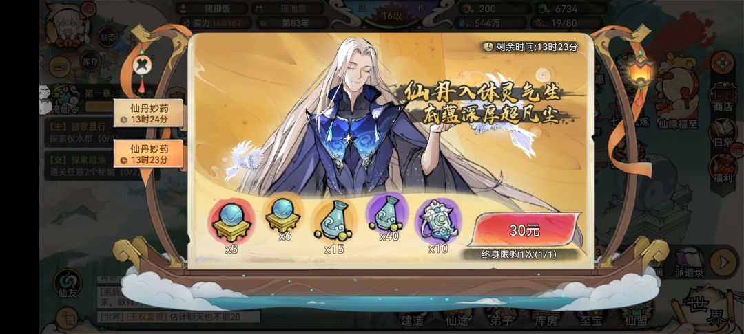 萌新第一天跟着主线任务慢慢玩就好,一般第一天都能升到14级宗门左右。记住一定要把行动力花光,也就是令牌!令牌是10分钟恢复一点,一天可以用三次灵玉恢复。这边建议三次都买了,反正送的灵玉很多。