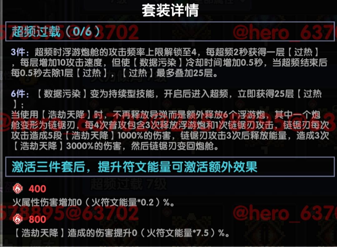 输出节奏:开启【数据污染】获得25层过热(250攻速),提供更多炮舱,同时点击【浩劫天降】释放链锯造成大量伤害→炮舱自毁