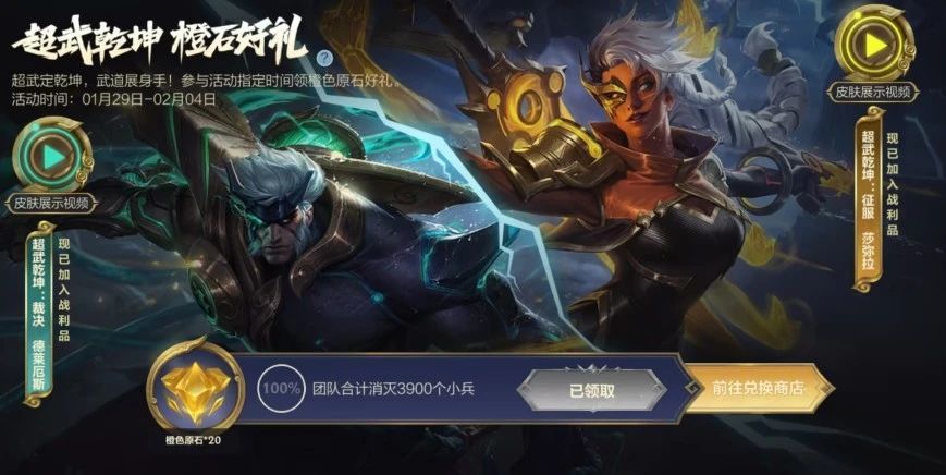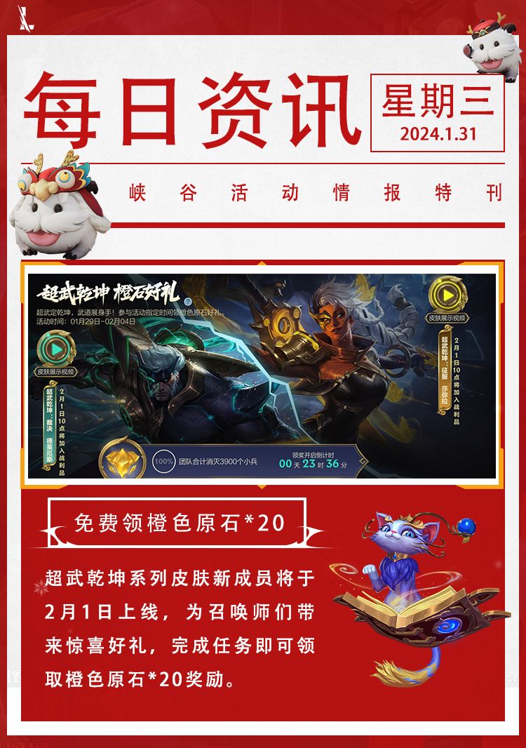 在“超武乾坤 橙石好礼”活动里,完成挑战即可免费领取橙色原石*20。此活动将于2月4日截止,召唤师记得抓紧时间领取哦~
