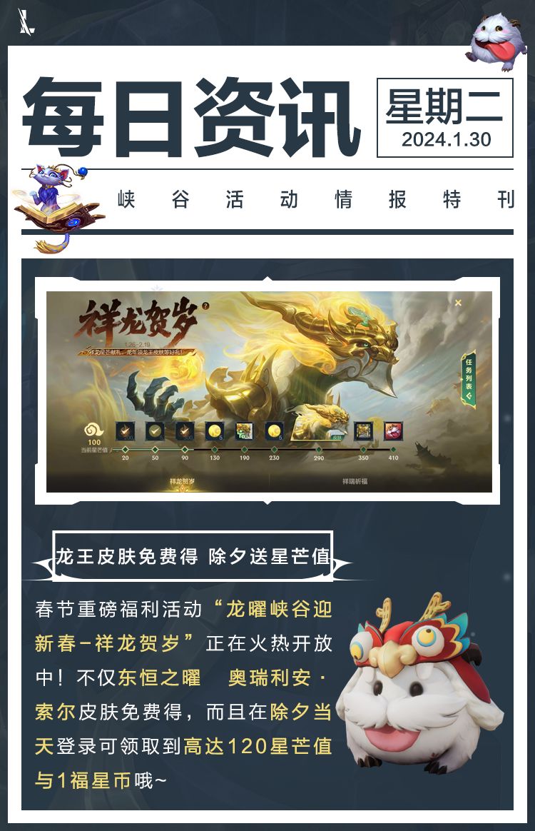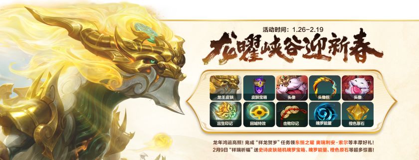 春节重磅福利活动“龙曜峡谷迎新春”火热开启中!参与“祥龙贺岁”活动积累星芒值,即可免费领“东恒之曜 奥瑞利安 · 索尔”皮肤。