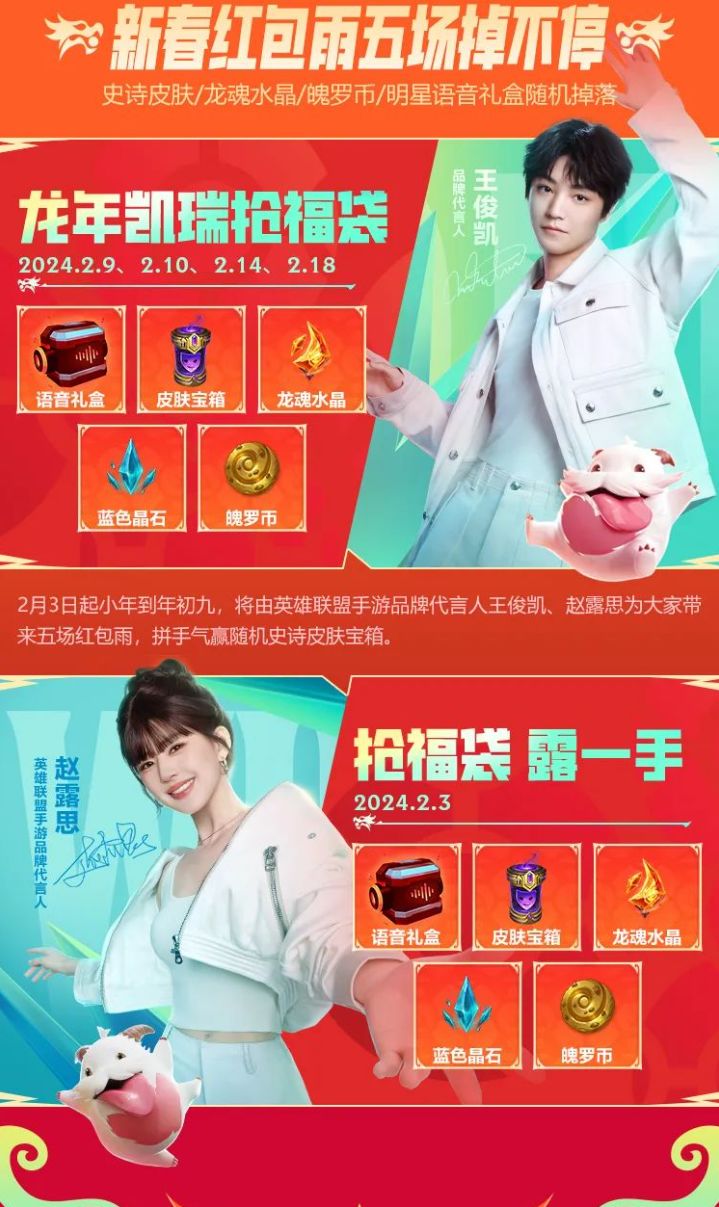 在2月3,9,10,14,18日期间,将由英雄联盟手游品牌代言人王俊凯,赵露思为大家带来五场红包雨,多款惊喜好礼在等着你!
