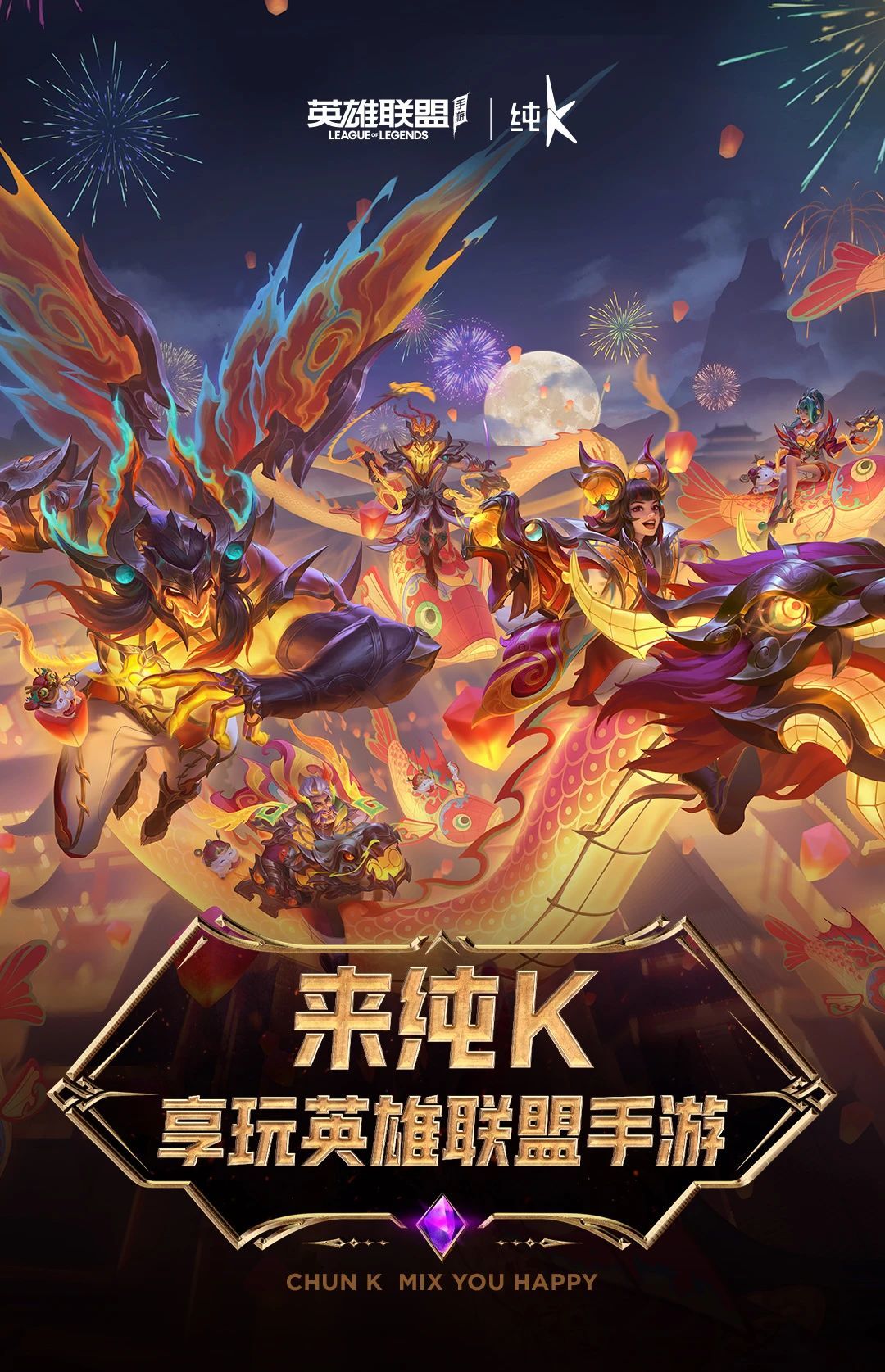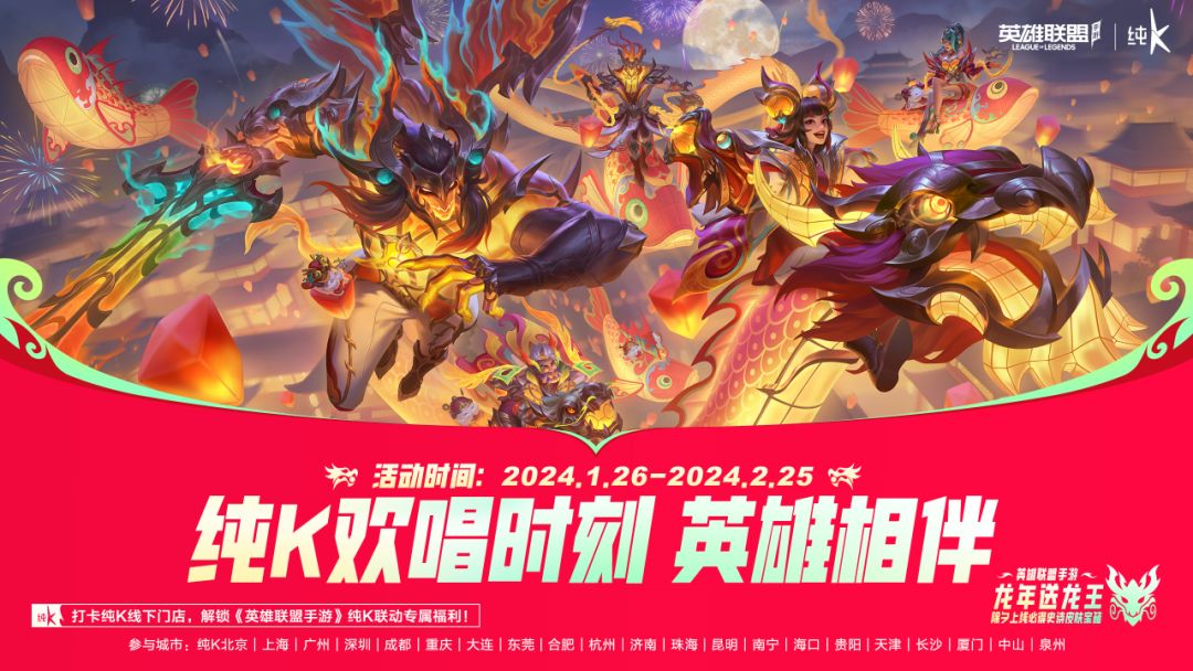 英雄联盟手游x纯K龙年献礼!召唤师于活动期间前往纯K门店,可享英雄联盟手游龙年限定Wi-Fi特权、购买纯K联动小食套餐就赠LOLM福利券、还有LOLM云游戏惊喜福利礼包限时开放!春节假期约上小伙伴在纯K欢聚高歌,一起峡谷开黑上大分!
