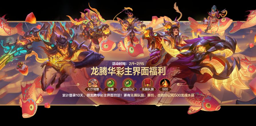 华彩送霸福!只需累计登录10天,可领龙腾华彩主界面背景,更有表情、击败印记、无畏队旗和龙魂水晶*500等好礼。