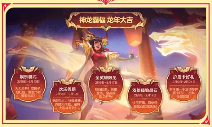 新年聚峡谷,龙年行大运!参与活动得明星语音包、海克斯护盾卡*9、还有幸运红包随机领。