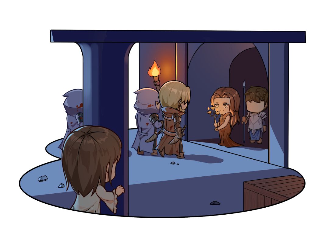 避暑庄园坐落在山间,清凉的空气舔舐着蕾奥妮的脖颈,光脚踩在红木地板上有些硌人,吊灯没有点亮,母亲端着烛台守迎父亲进屋。母亲身后没有女仆,而是披锁子甲的侍卫。父亲也没带马夫,随他进门的是斗篷裹身的几位兄长。