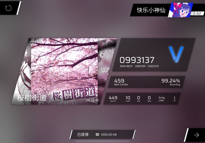 半夜刷到电子琵琶的视频于是入了坑,直奔《樱树街道》这一首去的,刚刚才知道自己2级越级打13级的歌了。。。但已经坚持贯彻笨鸟先飞原则,用了快两个小时一遍遍练,第一次只有B,第二次到A,后面慢慢到S到白V到蓝V。打完现在给我升到2.62级了,很开心,本来想继续练到满分,结果上网一看冷汗狂流,把不该踩的坑全都踩了,大家都说不要跨级、不要盯着一首歌,会留下错误的手癖(但是怎么判断自己有没有手癖qwq 如果已经有手癖了该怎么办 难道不是要刻意多练才能改正欸