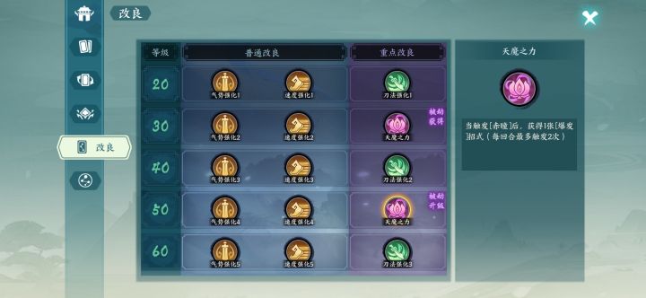 最后说“爆发”,有用但不多,“爆发”不会对“赤瞳”强化的裂伤招式提供任何收益,能吃到满额收益又不在冷板凳上的招式也只有天魔刀自带的单体或群体两张大招以及赤虎斩和赤霄,但赤虎和赤霄本就是功能性价值大于招式直接伤害,也许策划的本意“爆发”价值在赤瞳不济的时候补充裂伤招式伤害,但在使用过程中赤刀过牌是弱项,满改造的天魔刀法往往会有爆发没处用的窘境。