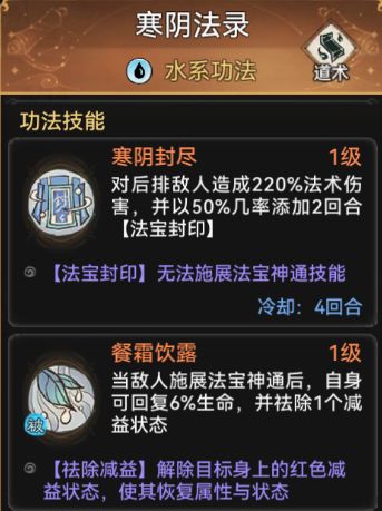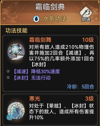 功法方面可以佩戴水系功法寒阴法录和霜临剑典走控制流。