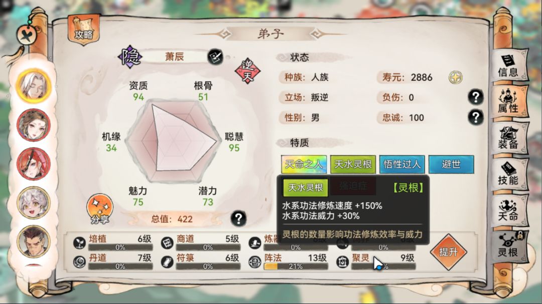 天赋则可以考虑浩然正气(效果抵抗 +10%)、幡天际地(武器为幡时,伤害减免+3%)