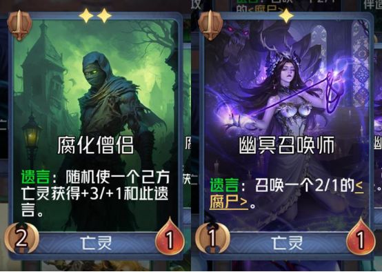 亡灵的核心机制是【遗言】,这些效果会在伙伴死亡后被触发,他们的效果可以分为2类:①在场上产生新的亡灵,②增强场上伙伴的属性。